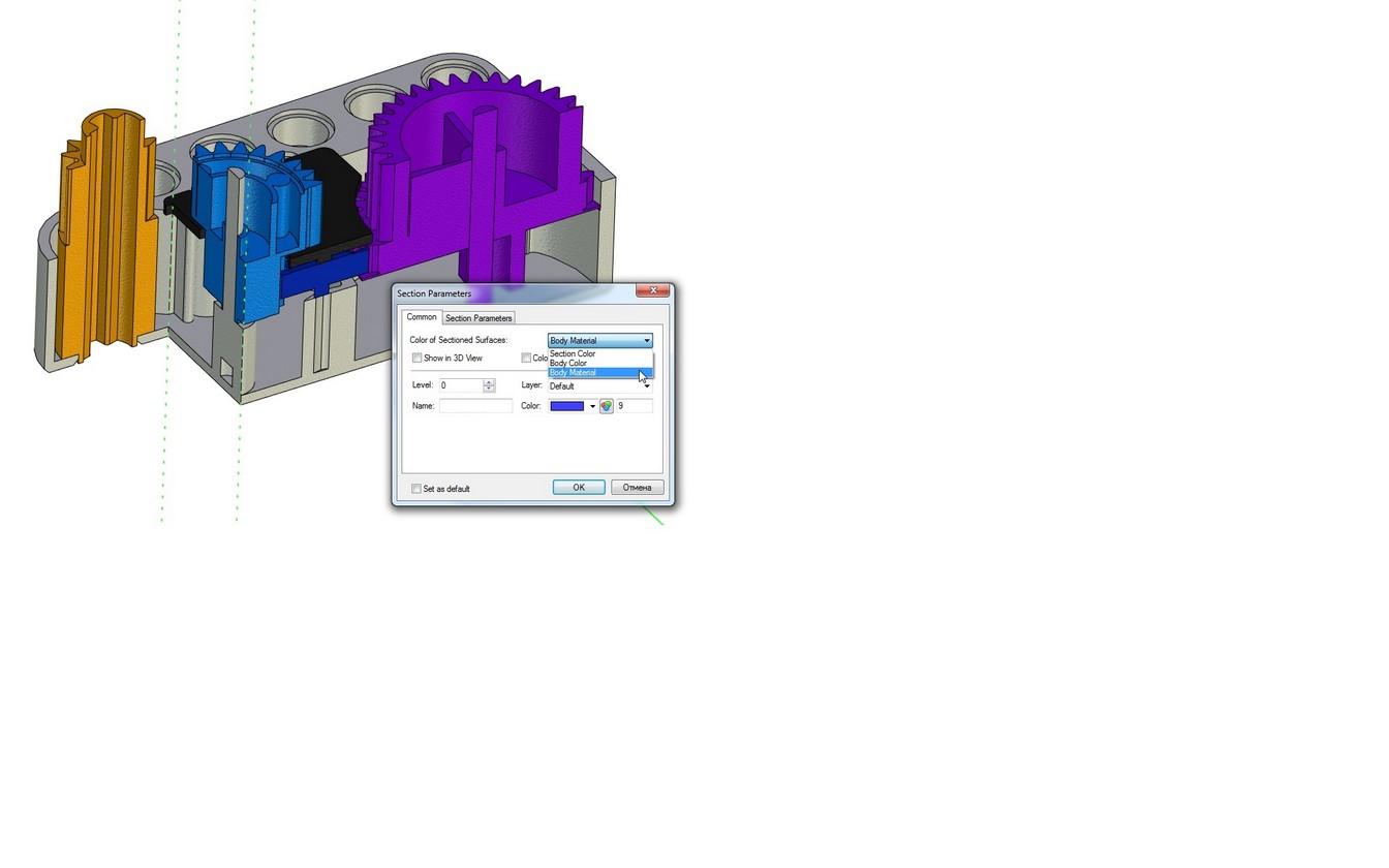 Body Color. When this flag is turned on, then the surface generated as a result of applying the section will be displayed in the same color, as the model. When the flag is cleared, color is used specified in this dialog.