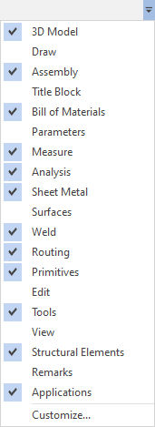 button located in the upper right corner of T-FLEX CAD main window, when using the ribbon interface, invokes the list of all ribbon tabs available for display. A tab is displayed in the ribbon, if its checkbox is enabled in the list. In order to enable or disable a checkbox, click