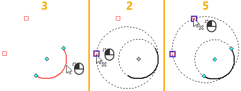 Second, third and fifth steps can be performed in any order. If the selection starts with selecting a node, then the first step is mandatory. If the selection starts with selecting a line, then it doesn't matter if the mode of creating circles passing through node is active or not - you may start the construction in the mode of creating circles centered at node as well. If a line is selected last, then the tangency configuration switching (fourth step) is not available.