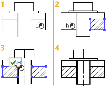 in drawing, the system automatically finds a closed contour enclosing the cursor position and uses it as a hatch contour. Only the graphic lines are taken into account. The method of contours search depends on parameters set in the Automatic Contour Scan tab of the parameters window. Upon selecting a contour it gets highlighted in blue. Upon selecting adjacent contours, they are merged.
