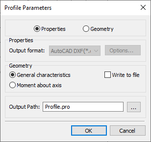 Upon selecting the Geometry option in the top section of the dialog, select the Output format in the Properties section and press OK. In result, the profile shape will be exported using the Output Path specified in the bottom section of the dialog. One of the following formats can be selected:
