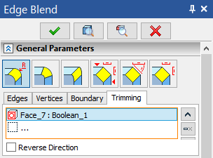 Blended edge is highlighted in green, saved boundary edge - red, trimming faces - blue |