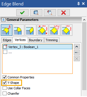 When two edges of opposite convexity are tangent at a vertex where three or more faces meet, a special option is available for blending the vertex - Y-shape. Blend surfaces created using this option are lesser curved in the transitional zone around the vertex, then surfaces created by default.
