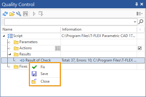 invokes the contextual menu that allows you to Fix detected errors, Save the result in the *.tfqmr format, or Close the result. When you click Fix, the fix results appear in the Fixes folder.
