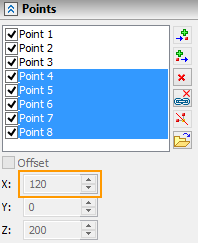 There is the possibility of multiple editing of points. The selection of the required points is carried out in the corresponding list in the parameters window. After this translation of the manipulator will affect the position of all selected points.