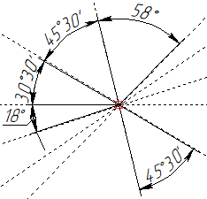 A chain of angular dimensions also always starts with a straight line. First dimension represents an angle between the starting line and another line intersecting with the starting one. Then, each subsequent dimension in the chain represents an angle between the ending line of the previous dimension and another line intersecting with the starting line of the chain in the same point, as the ending line of the first dimension. For all dimensions in the chain, dimension lines lay on the same circle centered in point of basic lines intersection. Moving a dimension line of a one dimension, results in moving all other dimensions belonging to the same chain, so that they stay on the same circle.