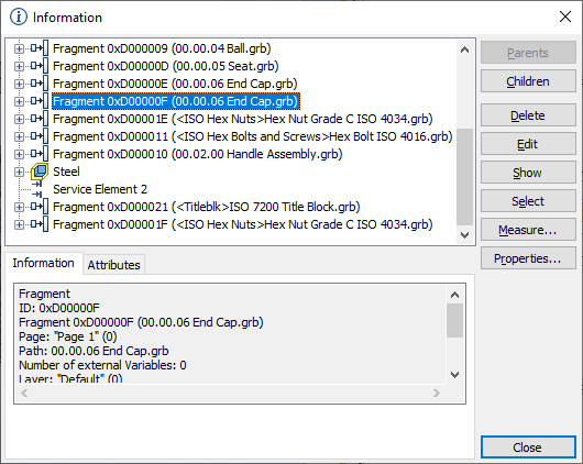 Information command, when no elements are selected, then the top level of the tree will contain 3D elements, that have no parents. Each subsequent level contains children of the elements of the previous level. The tree contains buttons for