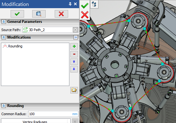 Two types of modification are available: Rounding and Length Change. No more than one modification of each type can be applied to a path.