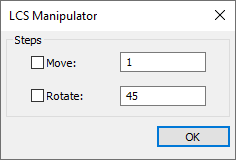 Manipulator settings dialog is common for all types of manipulators. Here you can define custom manipulator's movement step when applying Move (translation) and Rotate transformations, by typing the value into the input field to the right side of the corresponding checkbox. Move step is measured in the Length units set in the Document Parameters. Rotate step is measured in degrees. Enable the corresponding checkbox and click ОК to apply a custom step value. If the checkbox is disabled, then a custom value will be saved in system parameters upon clicking ОК, but will not be applied to manipulator's movement.