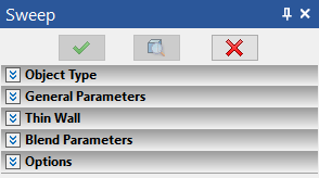 A non-modal dialogue can be collapsible, i.e. dialog parameter groups can be hidden. If you open a part of a dialog, then this sign is saved for this particular dialog, and the next time you enter this command, the window view will be saved. In the commands for creating 3D elements and operations in the Parameters window, the Finish input, Preview Operation Result and Exit command buttons are available, which work synchronously with the corresponding options in the automenu.