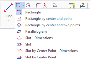 In the ribbon, as well as in the automenu of the Sketch command, options of rectangles creation are grouped into a drop-down list. The presence of the drop-down list is indicated by the black triangle near an icon of an option displayed, when the list is folded. The same list contains the polygon, parallelogram and slots creation options. In order to unfold the list, either click
