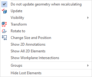The Do not update geometry when recalculating option is available in the contextual menu of 3D elements. If it's enabled, the element can only be updated using the Update selected element command.