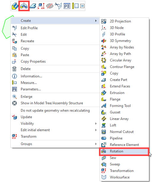 3D Model > Create > Rotation Workplane > 3D Model > Rotation |