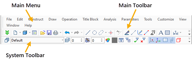 System Toolbar contains the fields for modifying current settings of entities, such as color, line type, level, and layer. Also contains controls for modifying layer configuration, level configuration of the current document, and selector settings.