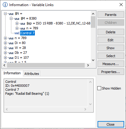 As a result of calling the command, the dialog box appears, listing all the variables of the drawing and their values in a tree layout. By default, only the visible variables are in the list. To view all variables of the given document (including hidden), set the flag Show Hidden.