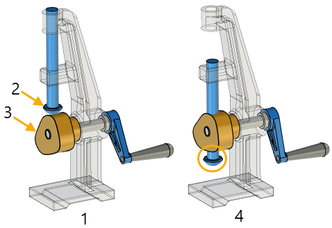 The diagrams show constraining parts of a schematic hydraulic cylinder by concentricity. Other parts of the simple mechanism arc connected by local coordinate systems. For viewing convenience, some parts of the mechanism are sectioned along the axis.