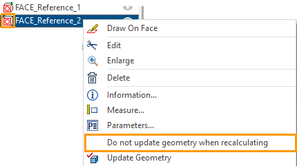 The Do not update geometry when recalculating option is available in the parameters of the reference element when it is created.