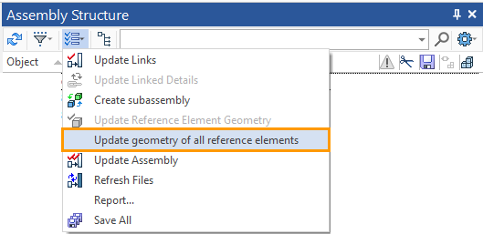 You can update reference elements through the Assembly Structure window only if the reference element does not have an option: Do not update geometry when recalculating. If the option is active for the reference element, the reference element need to be updated independently. You should use the Update the Geometry command in the context menu of the reference element in the 3D Model of the fragment file containing the reference element.