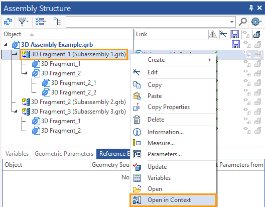 The fragment will be opened in the context of the Assembly we are in when we call edit a fragment in context. The Assembly Structure window displays the Assembly structure starting with the Assembly we are in when we call the open command in the context of the Assembly.